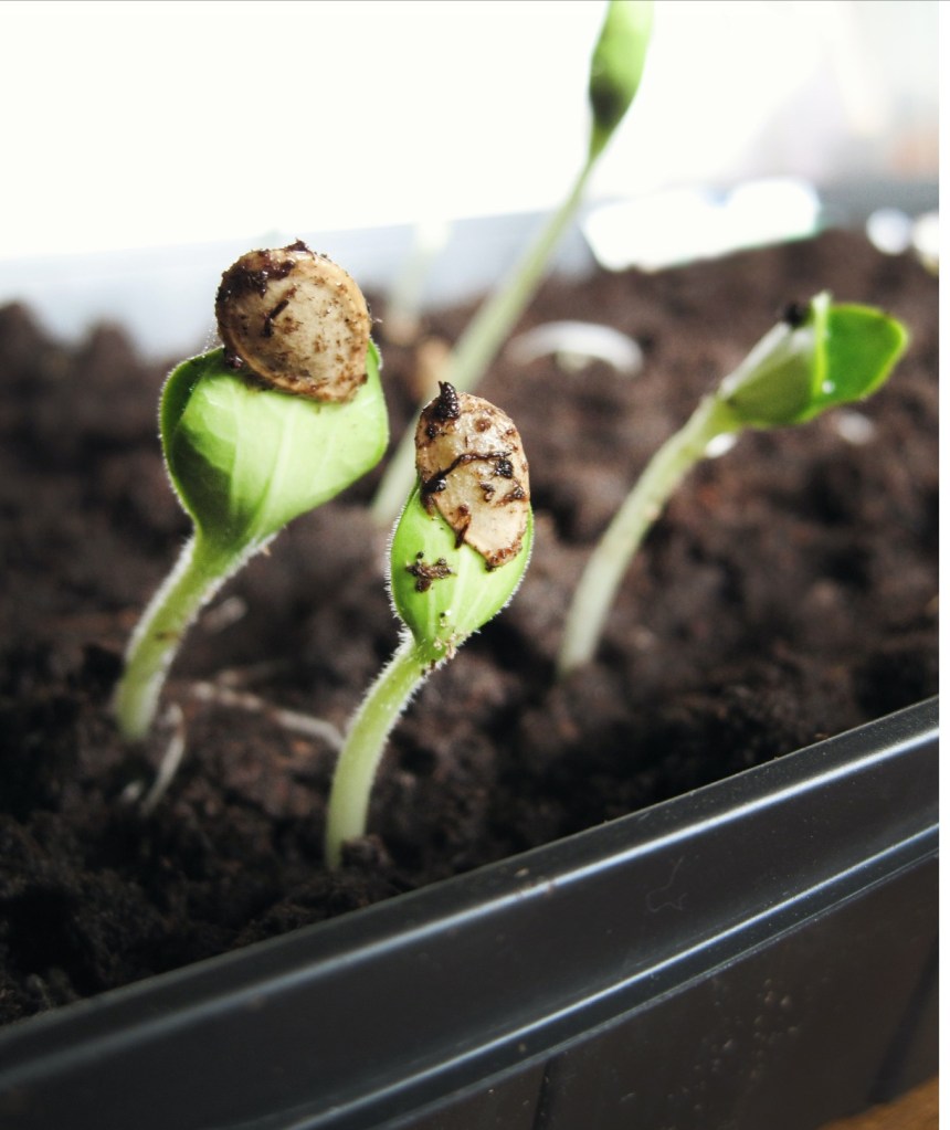 When I raised the covering over the tiny pots, there was a haze of palest green. Looking closer, I could see the seeds ~ those dried up, seemingly dead husks I’d put in the soil just a few days before ~ and they’d been transformed. There were tiny thread-like stems and big sturdy ones. Some were straight and some still curling from the tight enclosure of their casings, the remains of which they wore like crusty little caps.