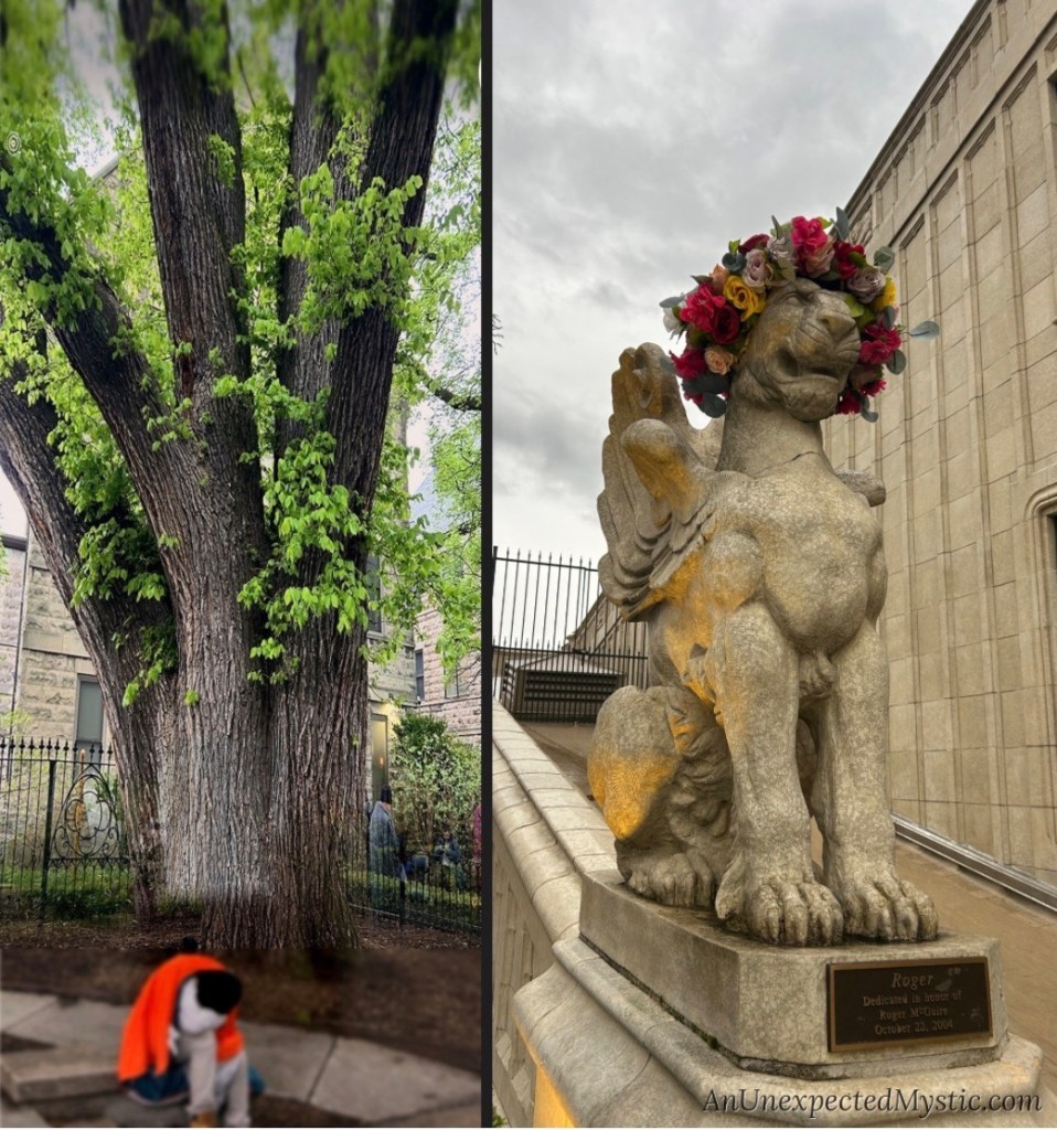 And this powerful being was crowned in flowers. The juxtaposition of strength and softness was delicious. Lions always bring to mind two beloved dead Leos, my husband Mike, and my friend Brenda. I admired this creature, said hello, and kept walking.